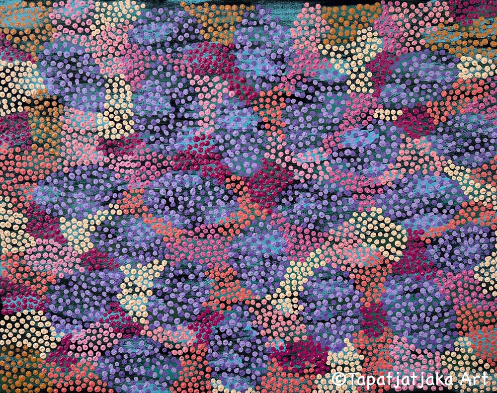 Josie started painting around 1980 after watching older family members and listening their stories. She also creates batik, bush jewellery and occasionally carves punu. Her artwork incorporates both contemporary designs and that of ancient Tjukurpa passed down by family members throughout time.