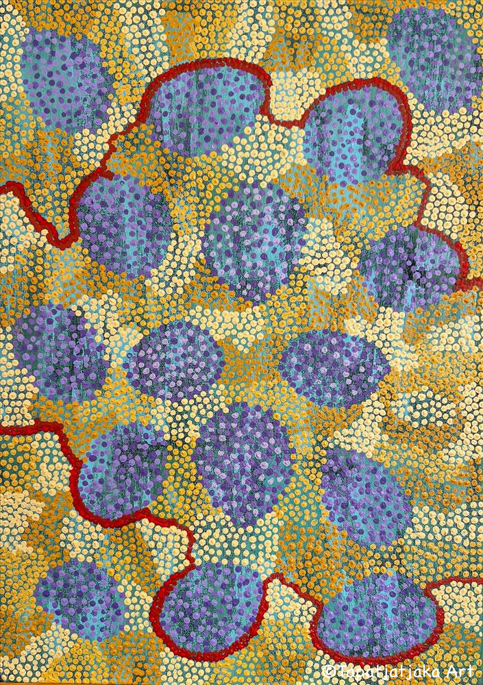 Josie started painting around 1980 after watching older family members and listening their stories.  She also creates batik, bush  jewellery and occasionally carves punu. Her artwork incorporates both contemporary designs and that of ancient Tjukurpa passed down by family members throughout time.