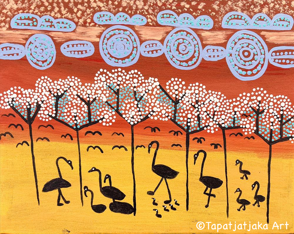 Marlene has painted a surreal desert landscape drawing on elements inspired by her country and memory and imagination.